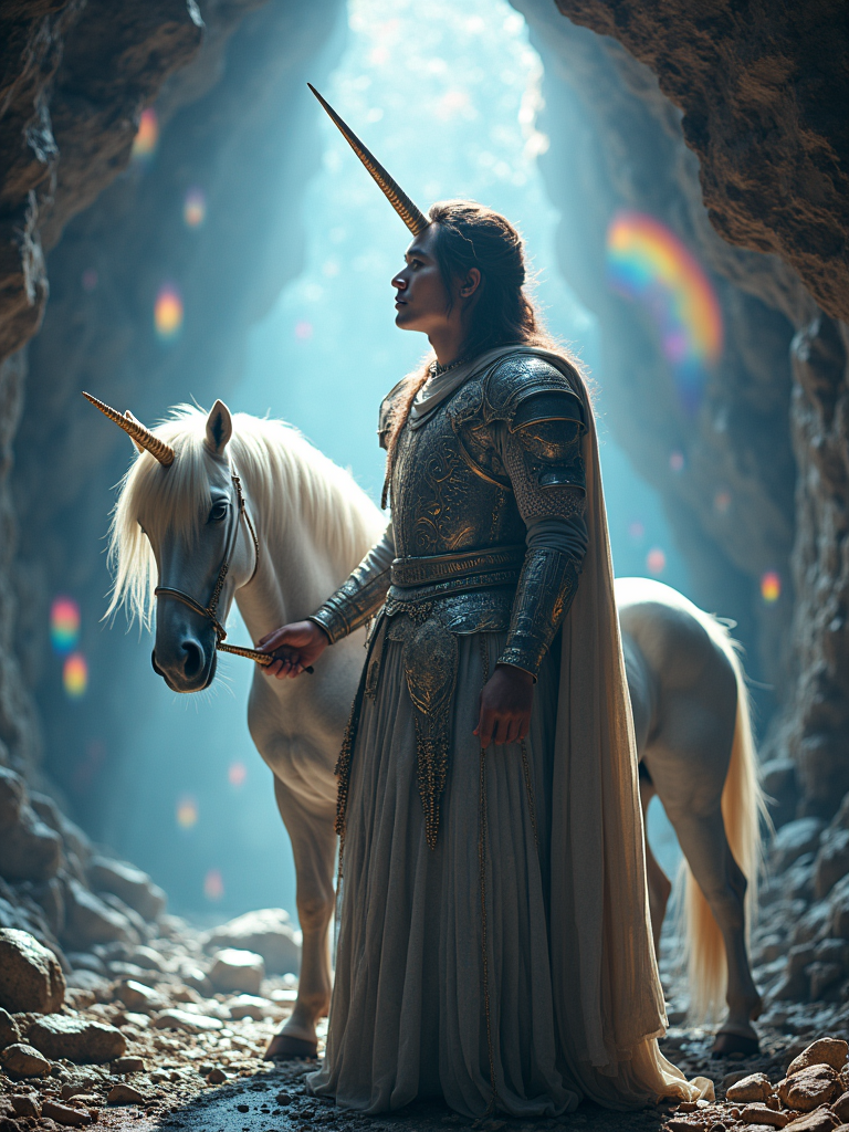 model as a unicorn guardian in mystical armor in a crystal cave with a family of unicorns, prismatic light creating rainbow reflections everywhere