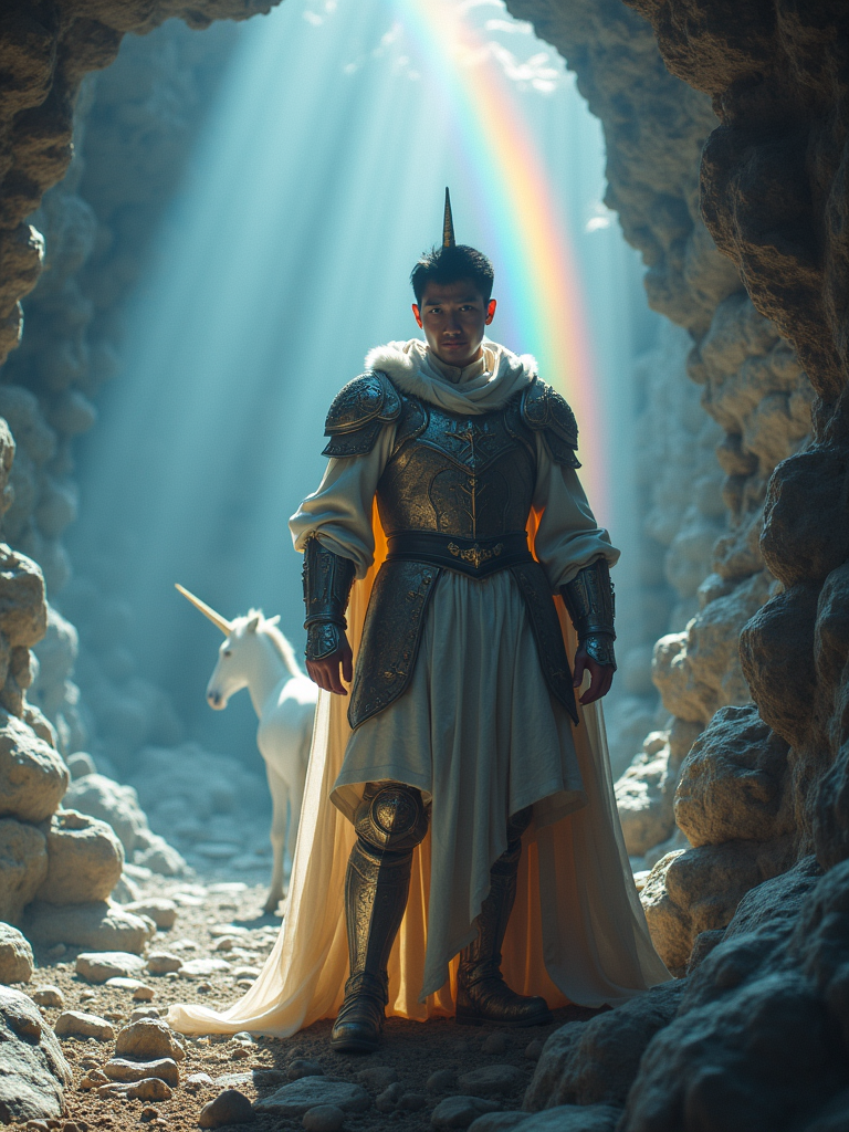 model as a unicorn guardian in mystical armor in a crystal cave with a family of unicorns, prismatic light creating rainbow reflections everywhere