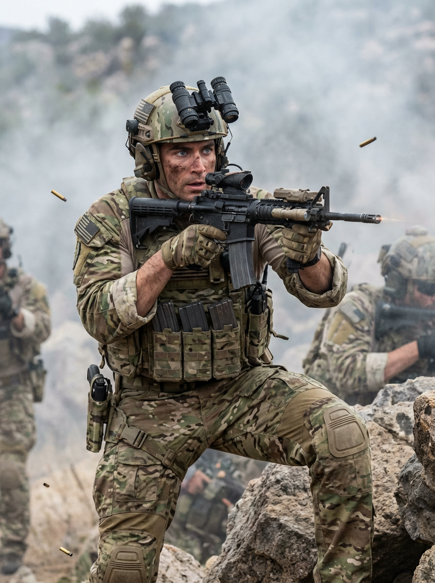 model as a US Navy Seal in firefight. highly detailed