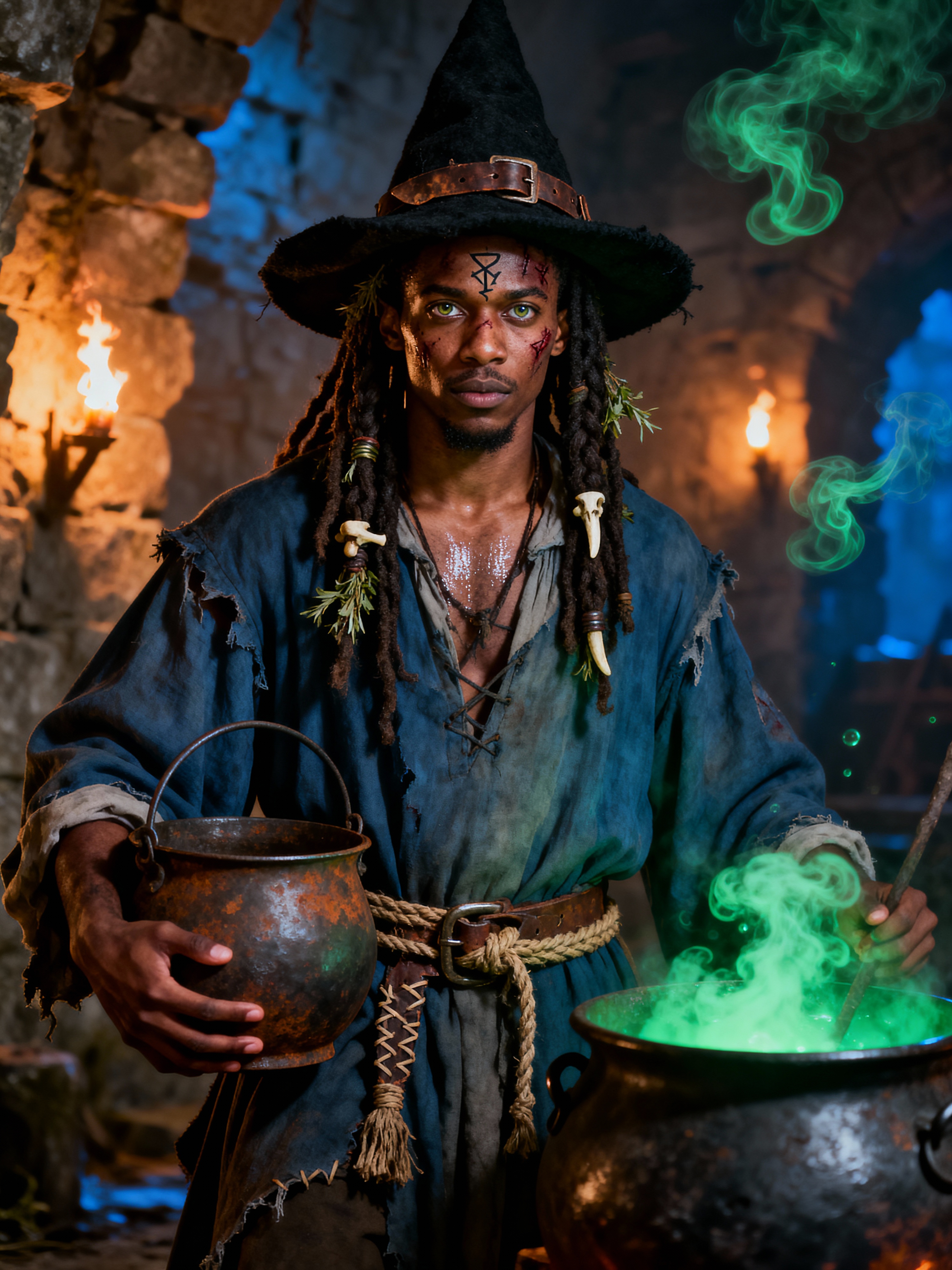 model as a Witch with a Alewife witch hat in the 14th century doing withcraft
