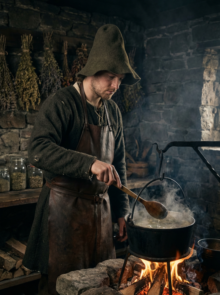 model as a Witch with a Alewife witch hat in the 14th century doing withcraft