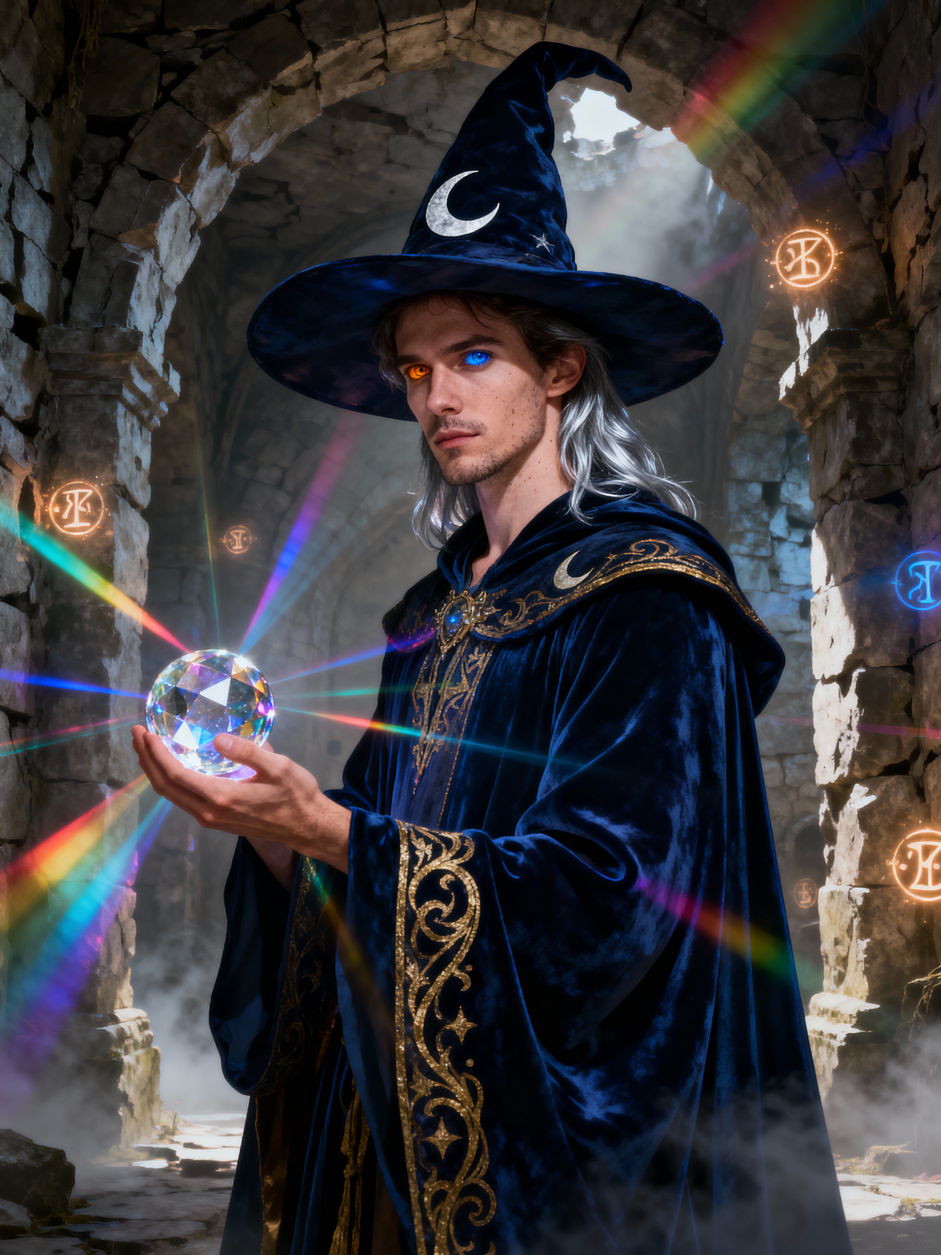 model as a Wizard with a Wizard robe and big hat, crystal magic, dramatic light