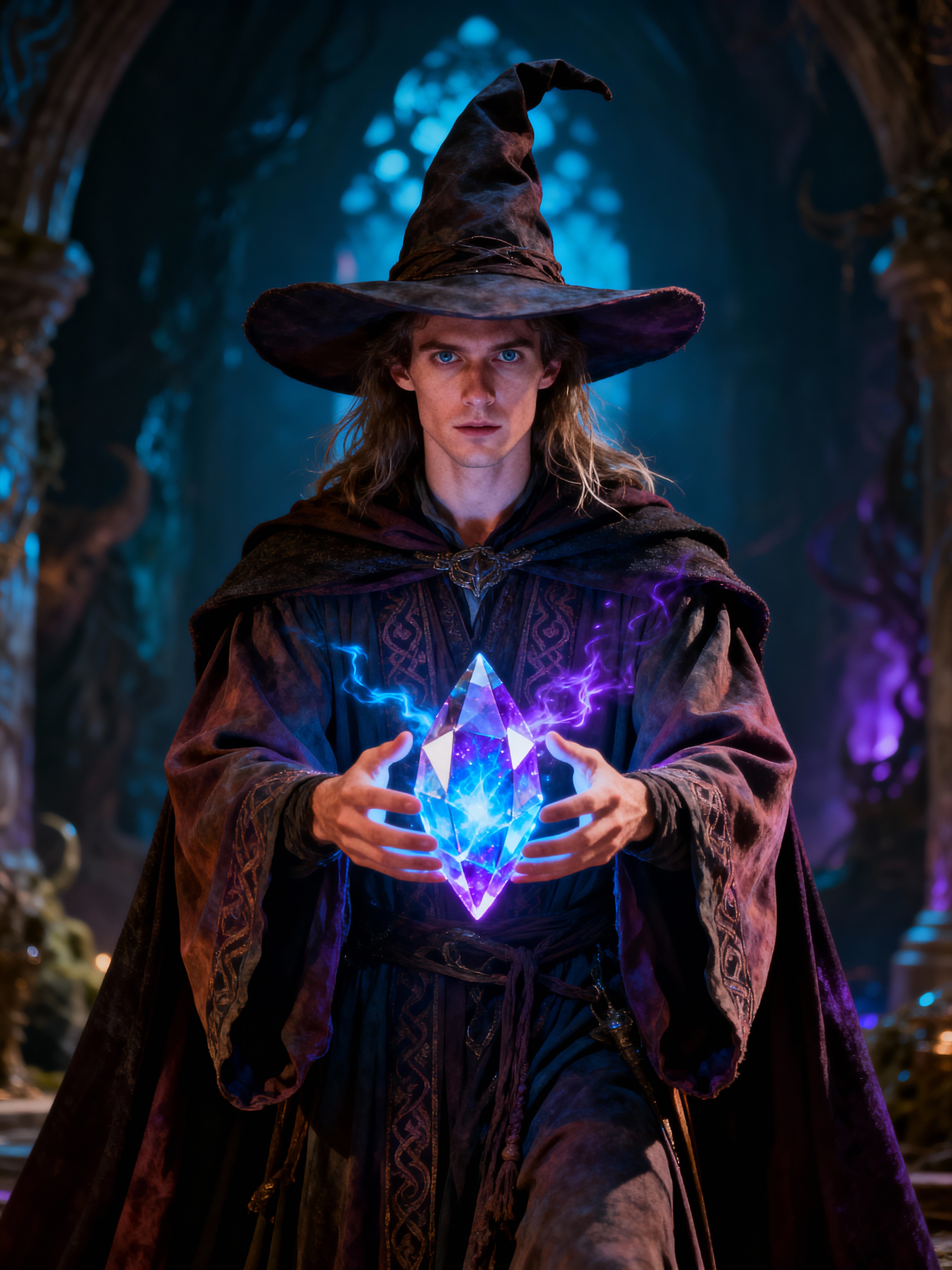 model as a Wizard with a Wizard robe and big hat, crystal magic, dramatic light