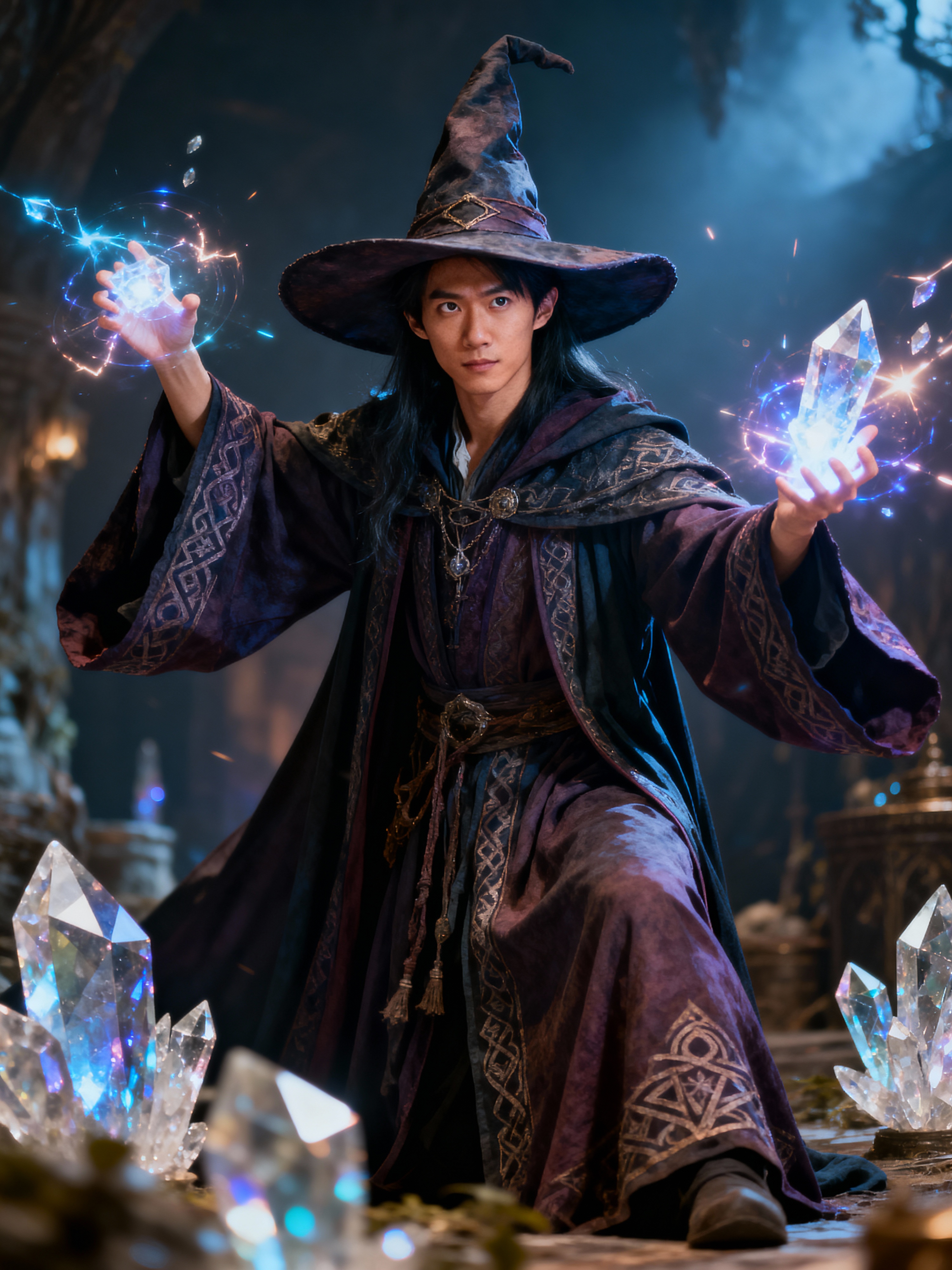 model as a Wizard with a Wizard robe and big hat, crystal magic, dramatic light