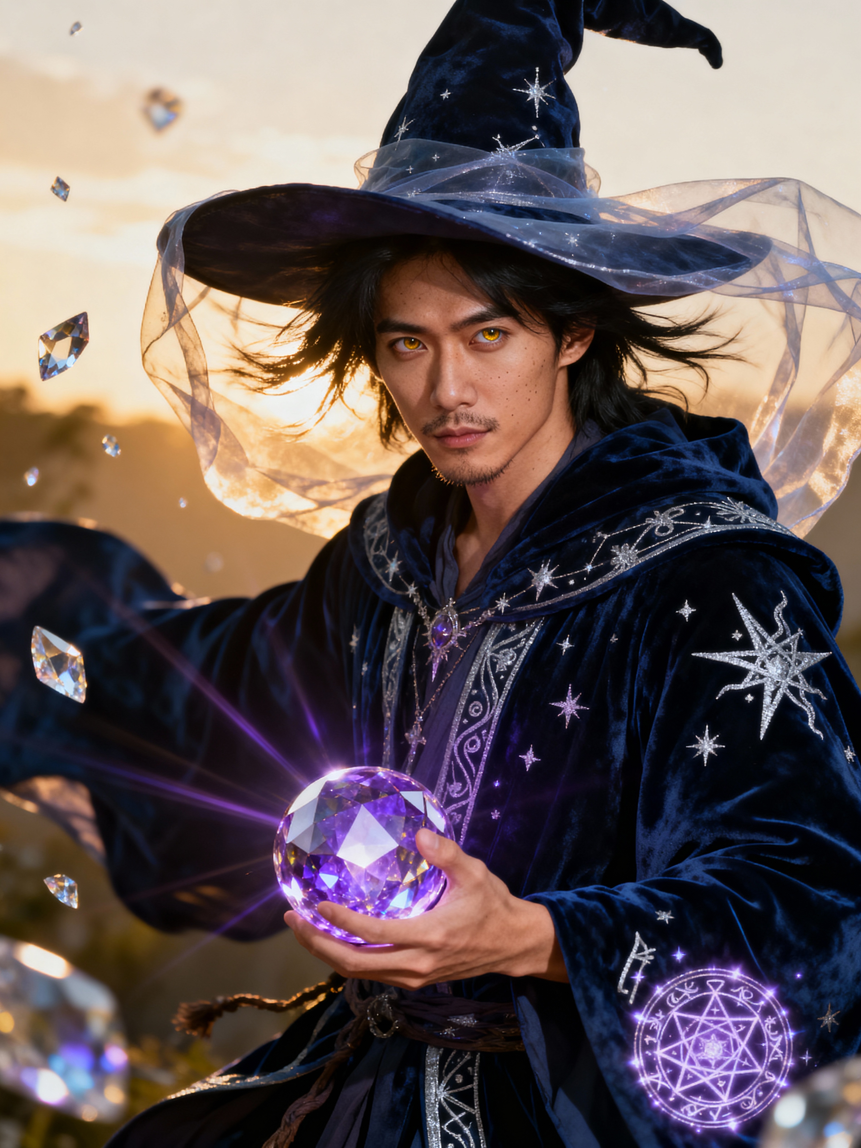 model as a Wizard with a Wizard robe and big hat, crystal magic, dramatic light