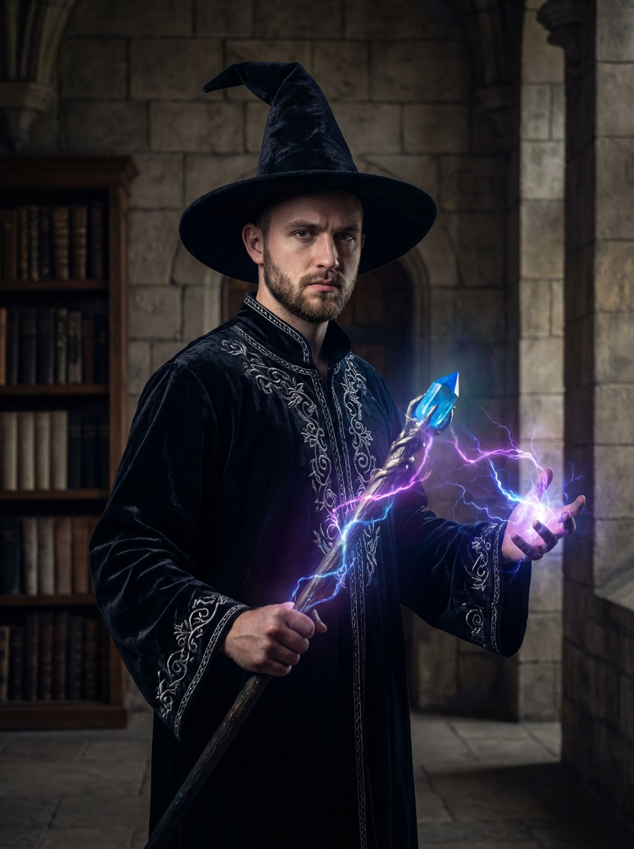 model as a Wizard with a Wizard robe and big hat, crystal magic, dramatic light