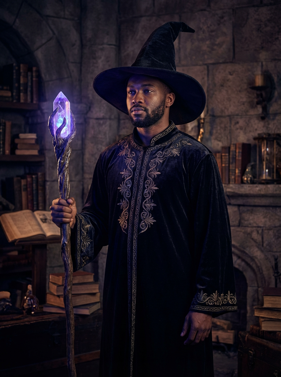 model as a Wizard with a Wizard robe and big hat, crystal magic, dramatic light