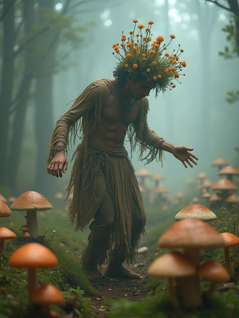 model as a woodland spirit with natural crown and earth magic dancing in a circle of mushrooms with soft fog and pastel lighting creating an otherworldly atmosphere