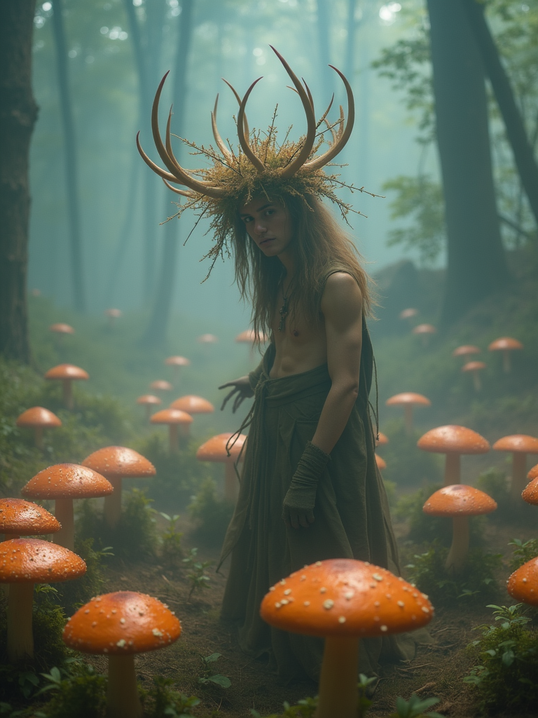 model as a woodland spirit with natural crown and earth magic dancing in a circle of mushrooms with soft fog and pastel lighting creating an otherworldly atmosphere