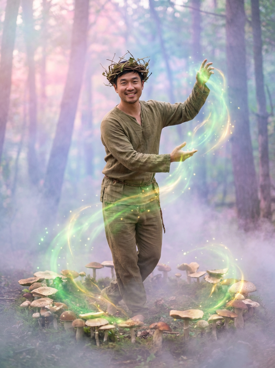 model as a woodland spirit with natural crown and earth magic dancing in a circle of mushrooms with soft fog and pastel lighting creating an otherworldly atmosphere