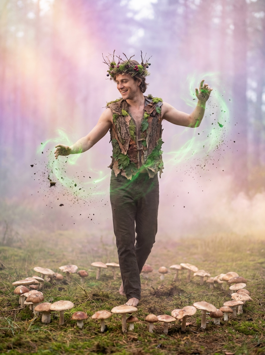 model as a woodland spirit with natural crown and earth magic dancing in a circle of mushrooms with soft fog and pastel lighting creating an otherworldly atmosphere