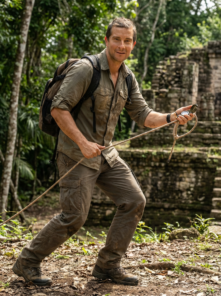 model as adventure book hero, action-ready pose, exotic location backdrop, exciting dynamic energy
