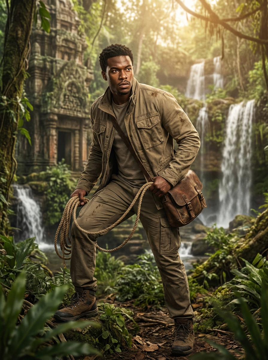 model as adventure book hero, action-ready pose, exotic location backdrop, exciting dynamic energy