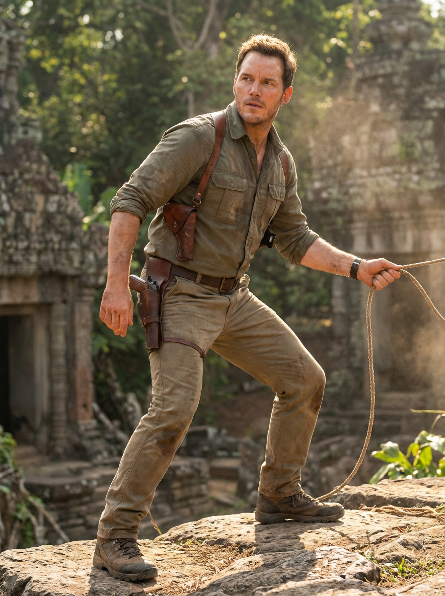 model as adventure book hero, action-ready pose, exotic location backdrop, exciting dynamic energy