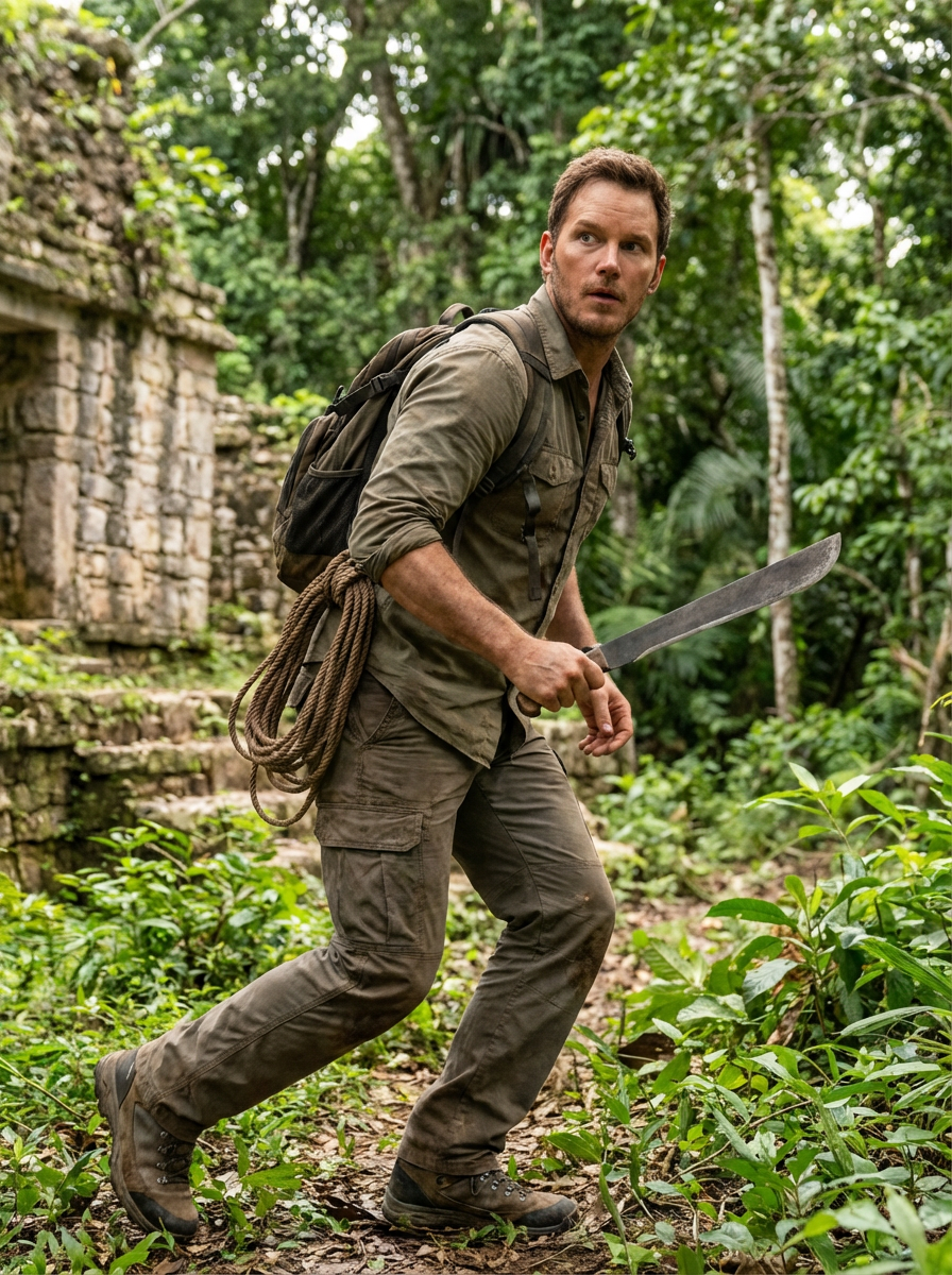 model as adventure book hero, action-ready pose, exotic location backdrop, exciting dynamic energy