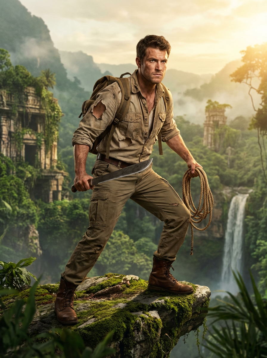 model as adventure book hero, action-ready pose, exotic location backdrop, exciting dynamic energy