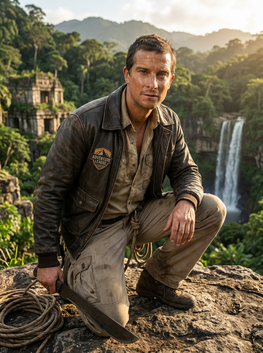 model as adventure book hero, action-ready pose, exotic location backdrop, exciting dynamic energy