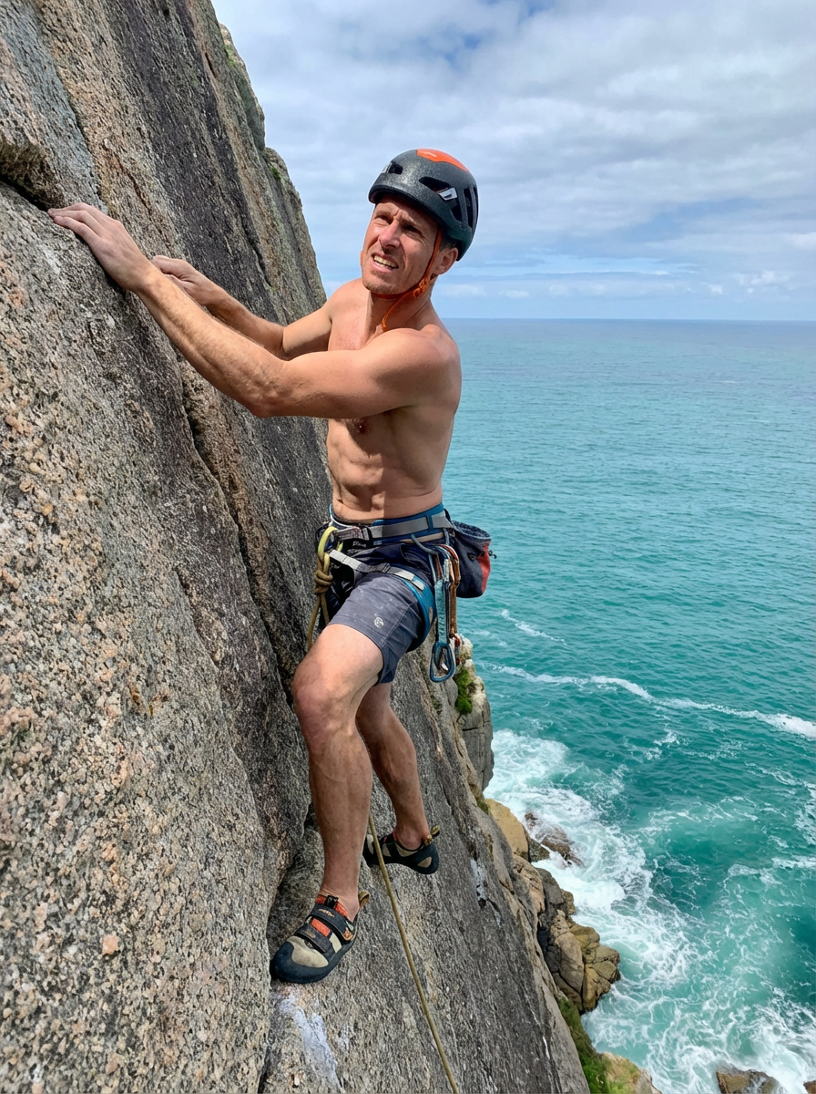model as adventurer rock climbing a daunting cliff with a breathtaking sea view