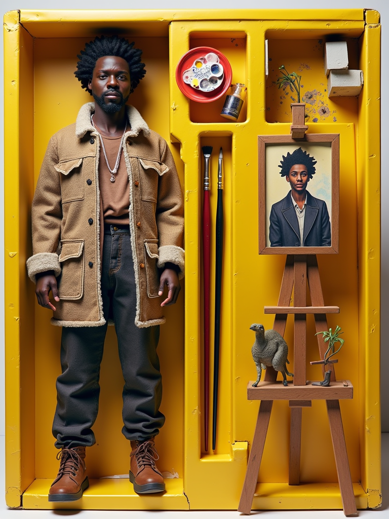 model as an action figure in packaging labeled 'ARTIST SERIES'. Use model as a reference for the face. Model is 6 inches tall and dressed in artistic attire, and holding a paintbrush. The cardboard section should be yellow. Include an 'Accessories' section with items like easel, paint palette, and art supplies. Make the design visually appealing and reflective of artistry. Do not include the character image on packaging.