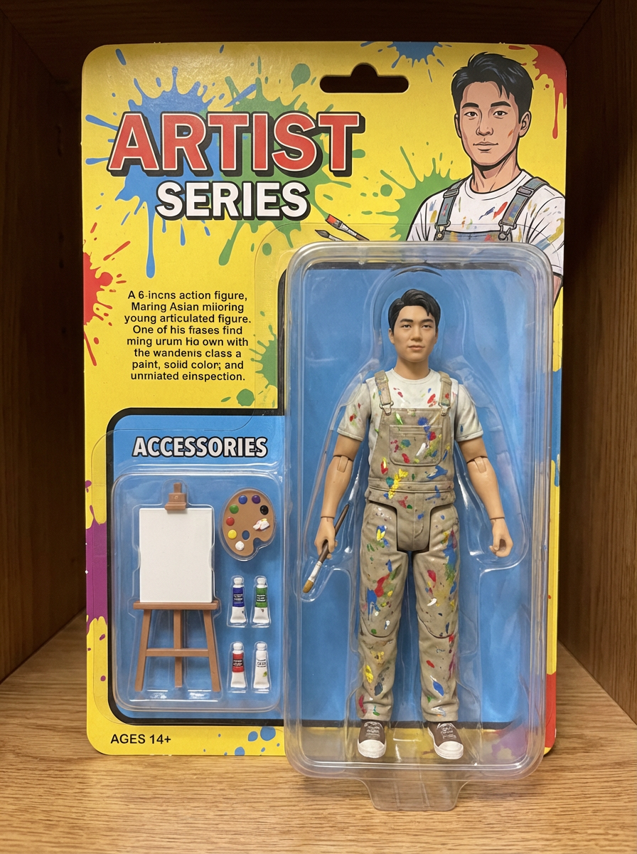 model as an action figure in packaging labeled 'ARTIST SERIES'. Use model as a reference for the face. Model is 6 inches tall and dressed in artistic attire, and holding a paintbrush. The cardboard section should be yellow. Include an 'Accessories' section with items like easel, paint palette, and art supplies. Make the design visually appealing and reflective of artistry. Do not include the character image on packaging.