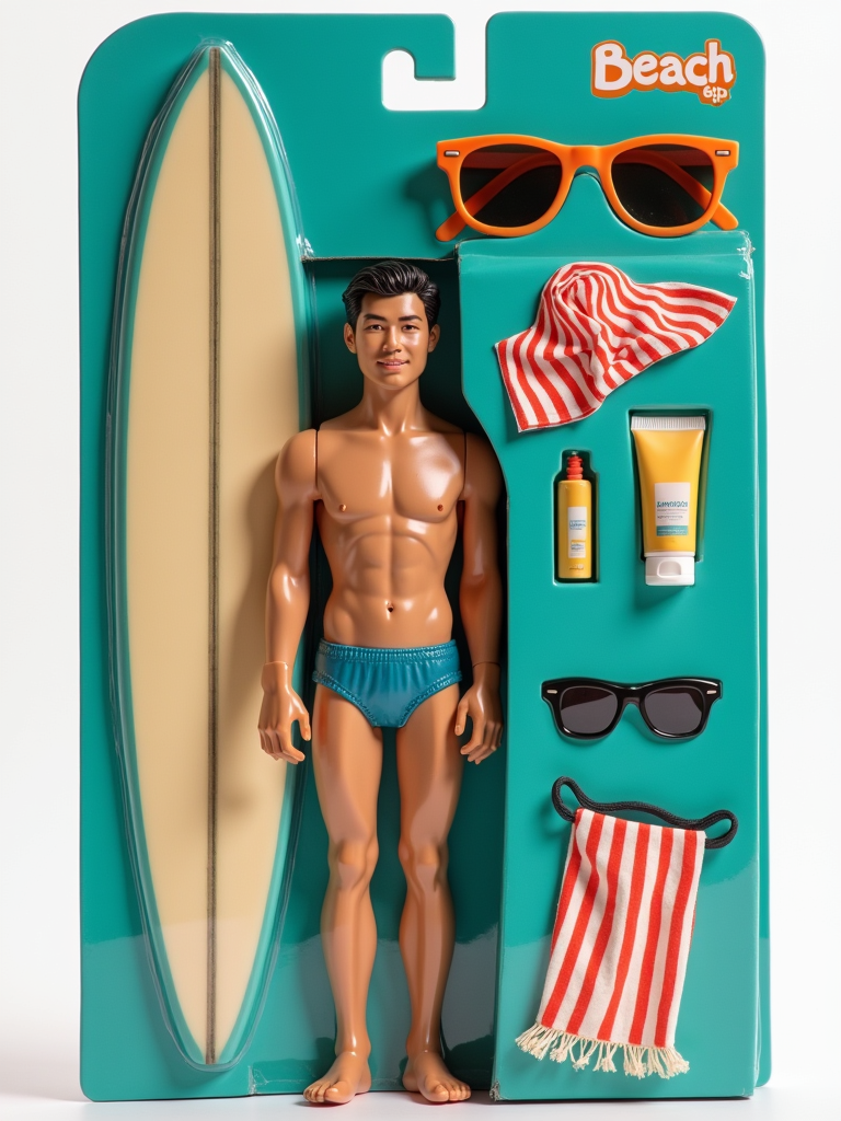 model as an action figure in packaging labeled 'BEACH SERIES'. Use model as a reference for the face. Model is 6 inches tall and dressed in swimwear, and holding a surfboard. The cardboard section should be teal. Include an 'Accessories' section with items like sunglasses, beach towel, and sunscreen. Make the design visually appealing and reflective of beach lifestyle. Do not include the character image on packaging.
