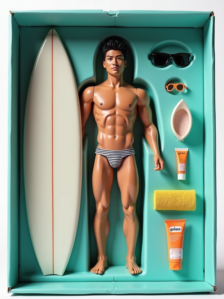 model as an action figure in packaging labeled 'BEACH SERIES'. Use model as a reference for the face. Model is 6 inches tall and dressed in swimwear, and holding a surfboard. The cardboard section should be teal. Include an 'Accessories' section with items like sunglasses, beach towel, and sunscreen. Make the design visually appealing and reflective of beach lifestyle. Do not include the character image on packaging.