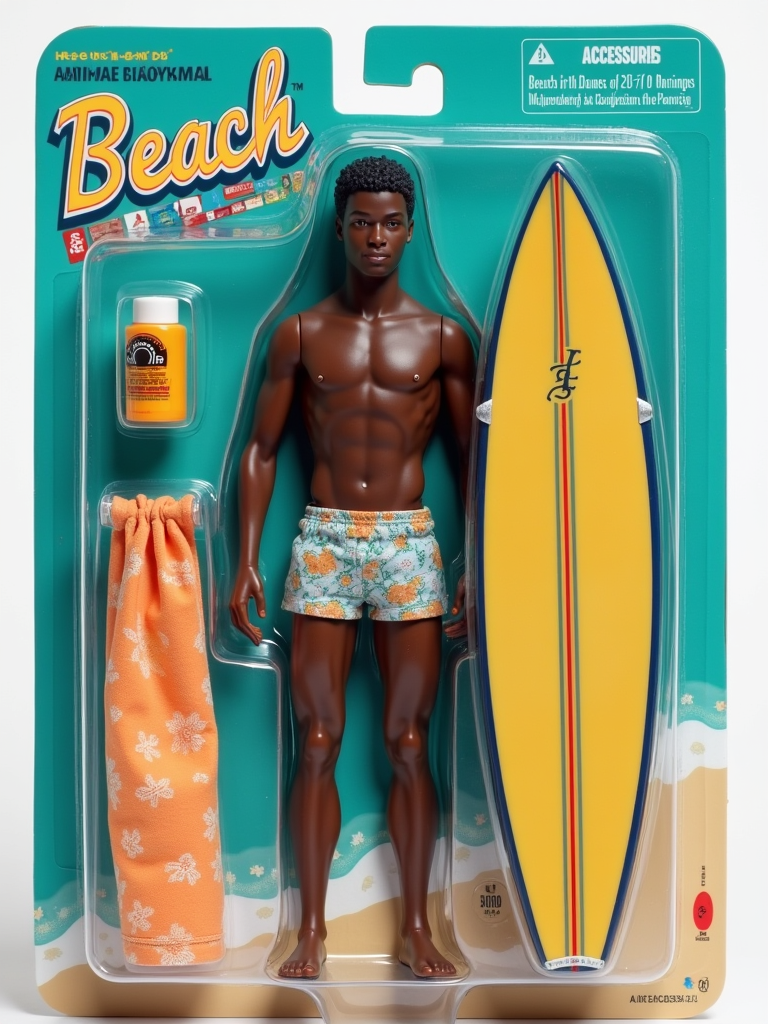 model as an action figure in packaging labeled 'BEACH SERIES'. Use model as a reference for the face. Model is 6 inches tall and dressed in swimwear, and holding a surfboard. The cardboard section should be teal. Include an 'Accessories' section with items like sunglasses, beach towel, and sunscreen. Make the design visually appealing and reflective of beach lifestyle. Do not include the character image on packaging.