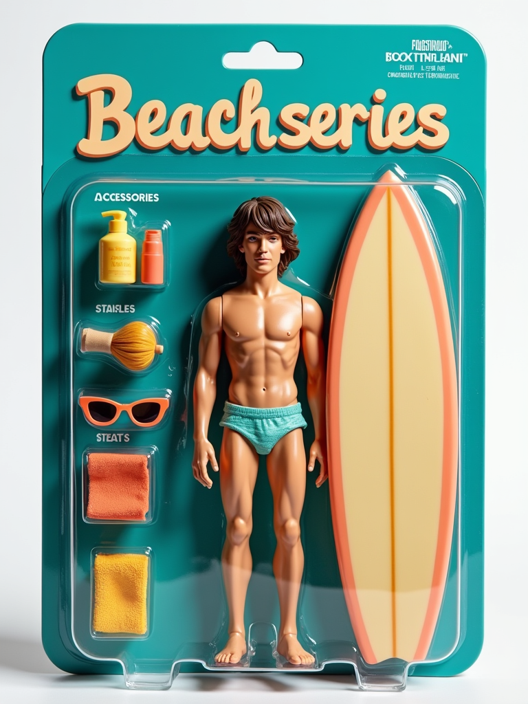 model as an action figure in packaging labeled 'BEACH SERIES'. Use model as a reference for the face. Model is 6 inches tall and dressed in swimwear, and holding a surfboard. The cardboard section should be teal. Include an 'Accessories' section with items like sunglasses, beach towel, and sunscreen. Make the design visually appealing and reflective of beach lifestyle. Do not include the character image on packaging.
