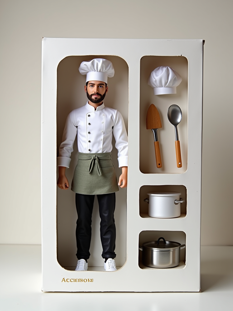 model as an action figure in packaging labeled 'CHEF COLLECTION'. Use model as a reference for the face. Model is 6 inches tall and dressed in chef uniform, and holding a spatula. The cardboard section should be white. Include an 'Accessories' section with items like chef hat, cooking pot, and recipe book. Make the design visually appealing and reflective of culinary arts. Do not include the character image on packaging.