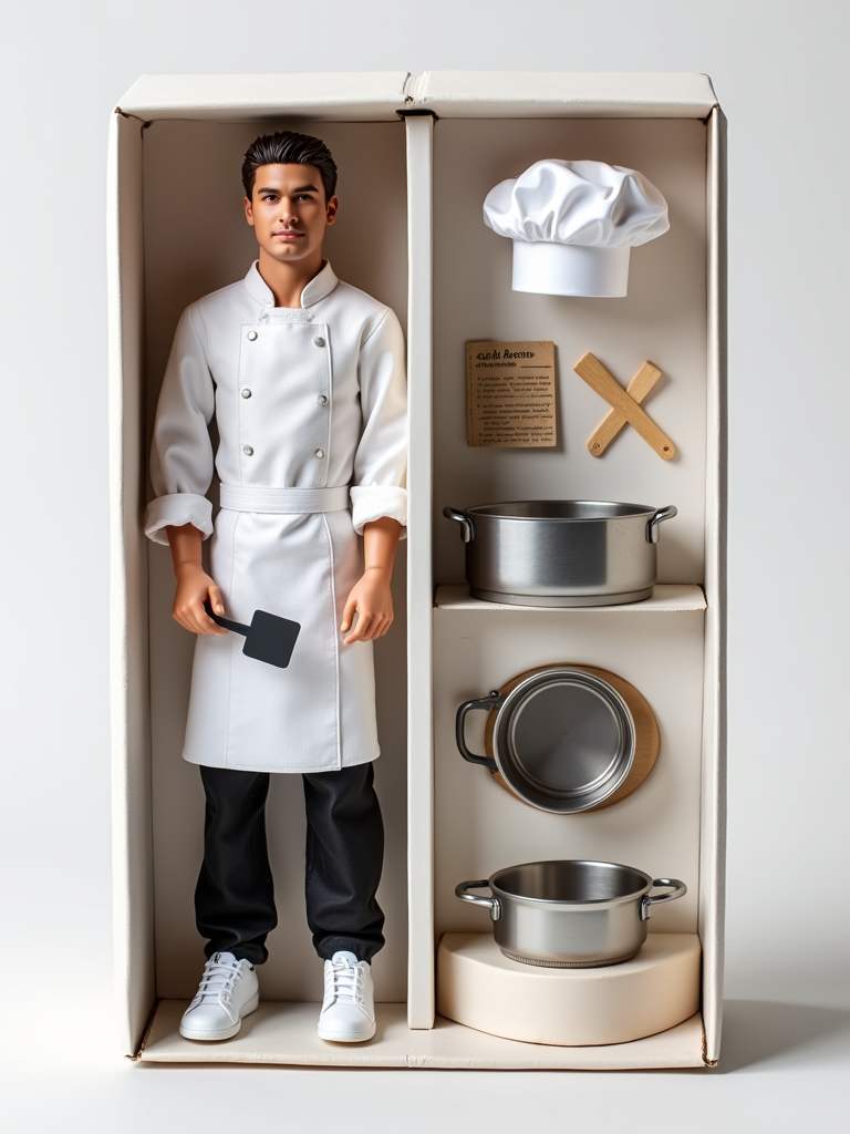 model as an action figure in packaging labeled 'CHEF COLLECTION'. Use model as a reference for the face. Model is 6 inches tall and dressed in chef uniform, and holding a spatula. The cardboard section should be white. Include an 'Accessories' section with items like chef hat, cooking pot, and recipe book. Make the design visually appealing and reflective of culinary arts. Do not include the character image on packaging.