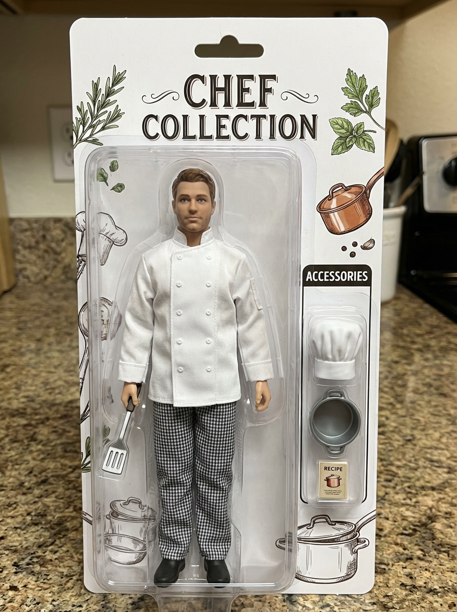 model as an action figure in packaging labeled 'CHEF COLLECTION'. Use model as a reference for the face. Model is 6 inches tall and dressed in chef uniform, and holding a spatula. The cardboard section should be white. Include an 'Accessories' section with items like chef hat, cooking pot, and recipe book. Make the design visually appealing and reflective of culinary arts. Do not include the character image on packaging.