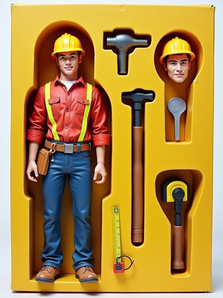 model as an action figure in packaging labeled 'CONSTRUCTION EDITION'. Use model as a reference for the face. Model is 6 inches tall and dressed in construction worker attire with hard hat, and holding a hammer. The cardboard section should be yellow. Include an 'Accessories' section with items like tool belt, safety goggles, and measuring tape. Make the design visually appealing and reflective of construction industry. Do not include the character image on packaging.