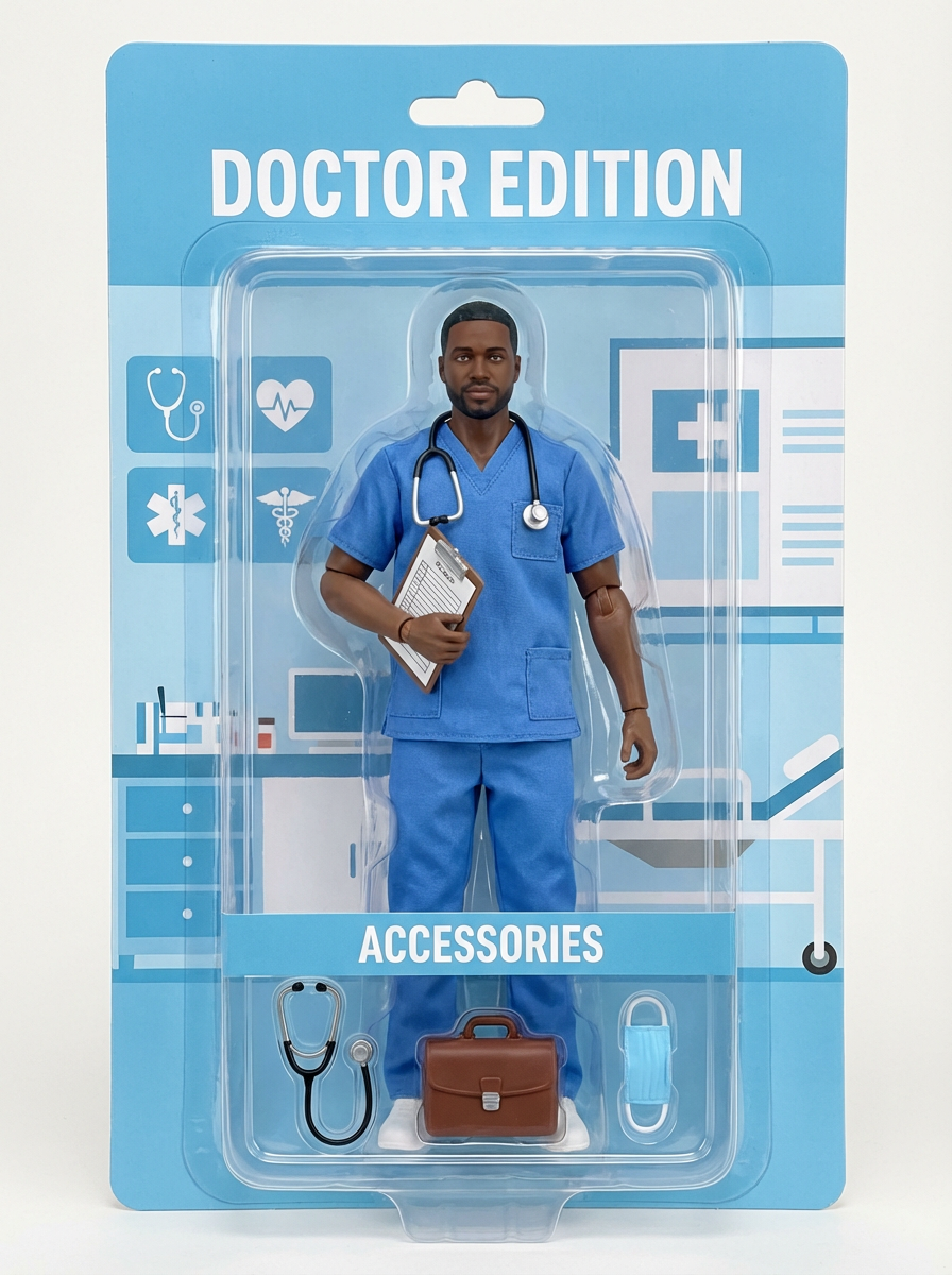 model as an action figure in packaging labeled 'DOCTOR EDITION'. Use model as a reference for the face. Model is 6 inches tall and dressed in medical scrubs with stethoscope, and holding a clipboard. The cardboard section should be light blue. Include an 'Accessories' section with items like stethoscope, medical bag, and surgical mask. Make the design visually appealing and reflective of healthcare profession. Do not include the character image on packaging.