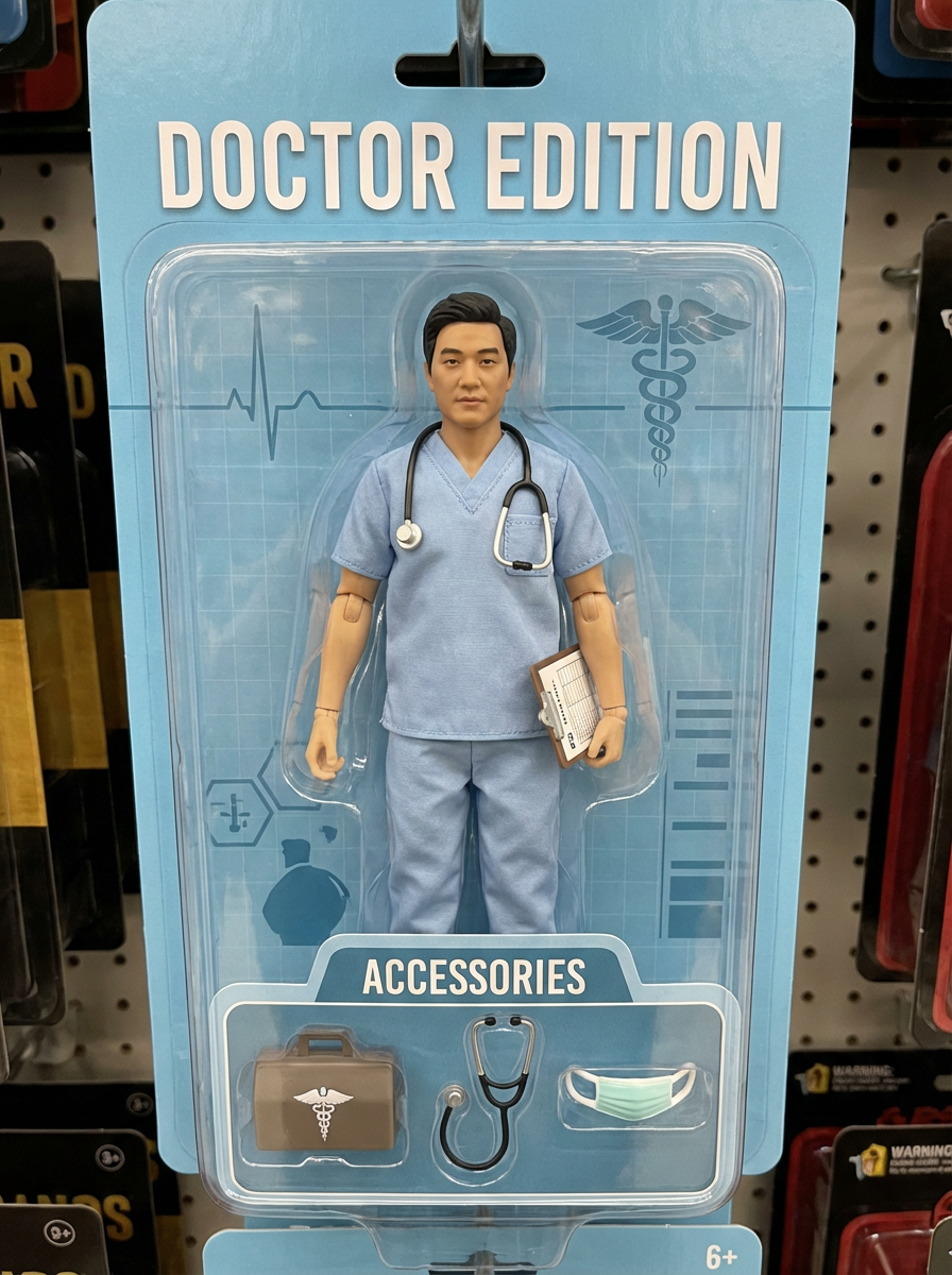 model as an action figure in packaging labeled 'DOCTOR EDITION'. Use model as a reference for the face. Model is 6 inches tall and dressed in medical scrubs with stethoscope, and holding a clipboard. The cardboard section should be light blue. Include an 'Accessories' section with items like stethoscope, medical bag, and surgical mask. Make the design visually appealing and reflective of healthcare profession. Do not include the character image on packaging.