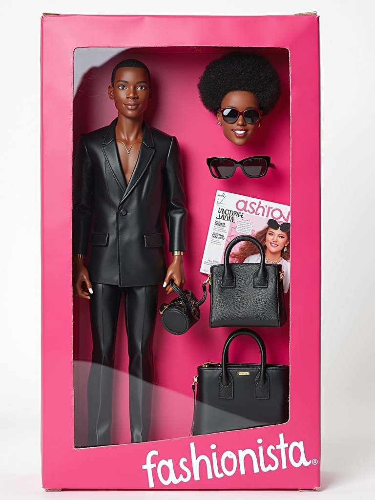 model as an action figure in packaging labeled 'FASHIONISTA'. Use model as a reference for the face. Model is 6 inches tall and dressed in fashionable attire, and holding a handbag. The cardboard section should be pink. Include an 'Accessories' section with items like sunglasses, handbag, and fashion magazine. Make the design visually appealing and reflective of fashion industry. Do not include the character image on packaging.