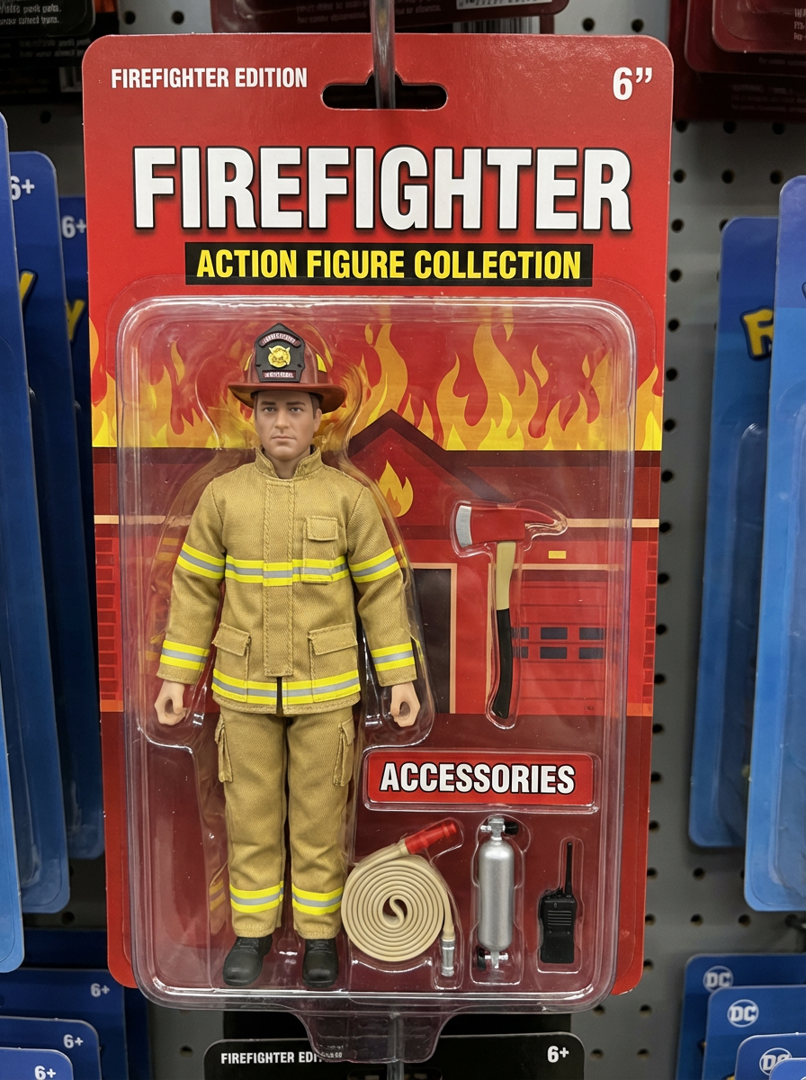 model as an action figure in packaging labeled 'FIREFIGHTER EDITION'. Use model as a reference for the face. Model is 6 inches tall and dressed in firefighter uniform with helmet, and holding an axe. The cardboard section should be red. Include an 'Accessories' section with items like fire hose, oxygen tank, and radio. Make the design visually appealing and reflective of firefighting profession. Do not include the character image on packaging.