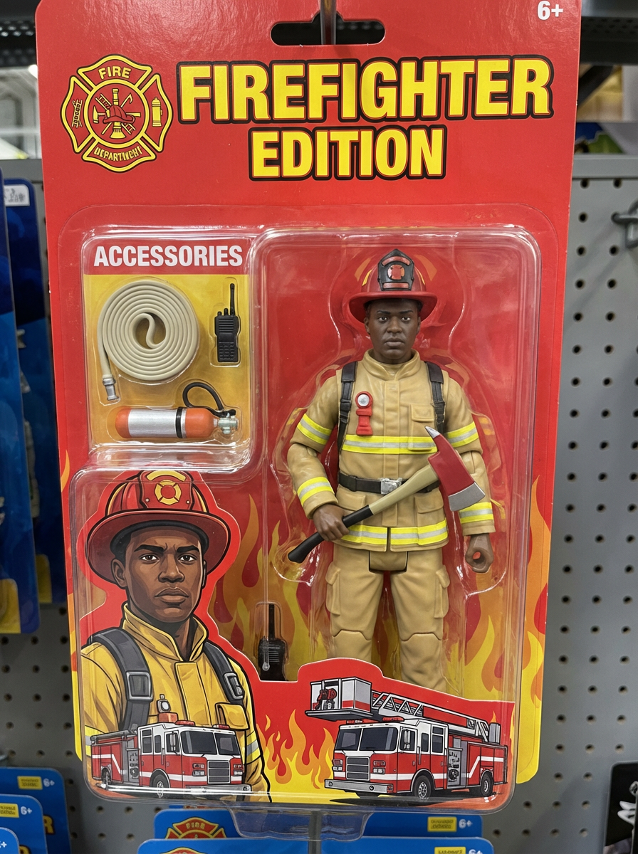 model as an action figure in packaging labeled 'FIREFIGHTER EDITION'. Use model as a reference for the face. Model is 6 inches tall and dressed in firefighter uniform with helmet, and holding an axe. The cardboard section should be red. Include an 'Accessories' section with items like fire hose, oxygen tank, and radio. Make the design visually appealing and reflective of firefighting profession. Do not include the character image on packaging.