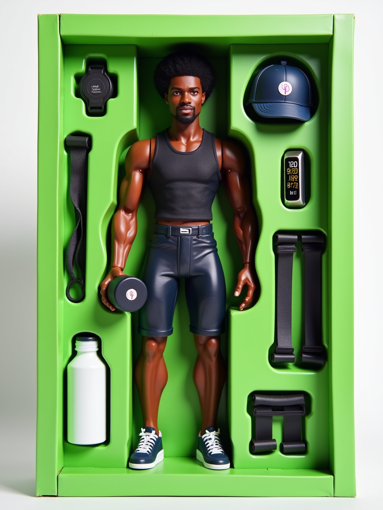 model as an action figure in packaging labeled 'FITNESS EDITION'. Use model as a reference for the face. Model is 6 inches tall and dressed in athletic wear, and holding a dumbbell. The cardboard section should be green. Include an 'Accessories' section with items like water bottle, fitness tracker, and resistance bands. Make the design visually appealing and reflective of fitness industry. Do not include the character image on packaging.