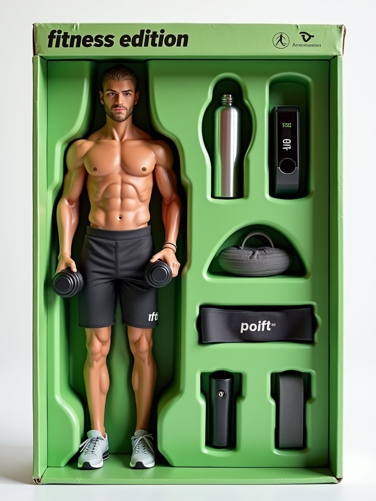 model as an action figure in packaging labeled 'FITNESS EDITION'. Use model as a reference for the face. Model is 6 inches tall and dressed in athletic wear, and holding a dumbbell. The cardboard section should be green. Include an 'Accessories' section with items like water bottle, fitness tracker, and resistance bands. Make the design visually appealing and reflective of fitness industry. Do not include the character image on packaging.