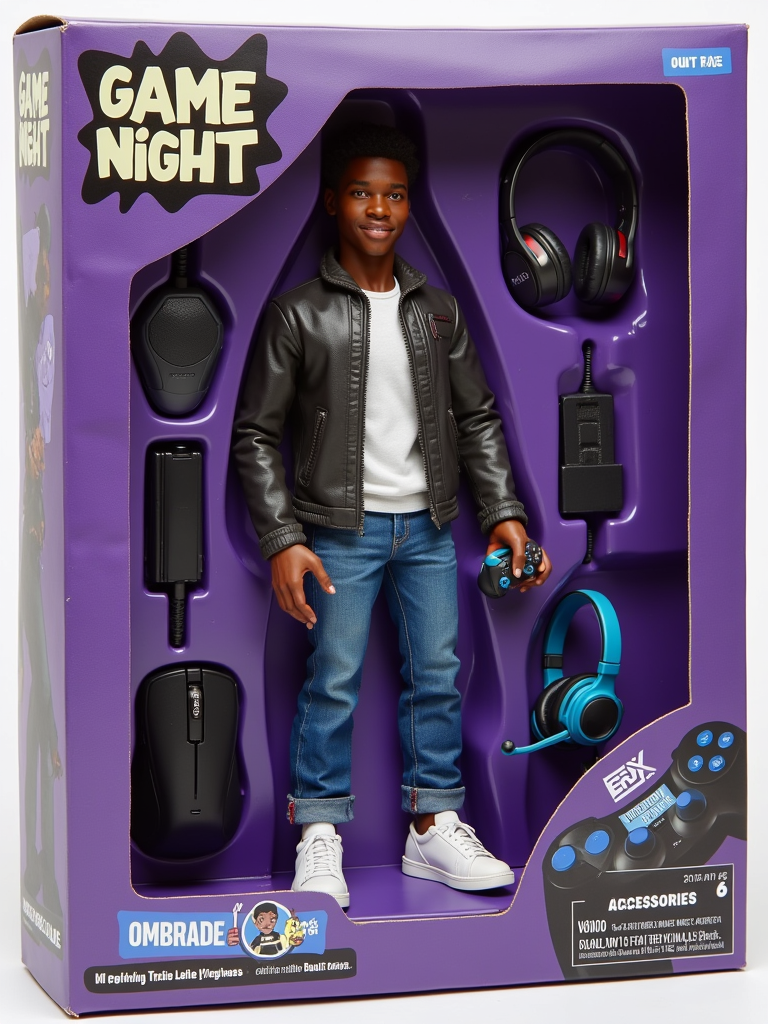 model as an action figure in packaging labeled 'GAME NIGHT'. Use model as a reference for the face. Model is 6 inches tall and dressed in casual gaming attire, and holding a controller. The cardboard section should be purple. Include an 'Accessories' section with items like gaming mouse, gaming headset, and gaming console. Make the design visually appealing and reflective of gaming culture. Do not include the character image on packaging.