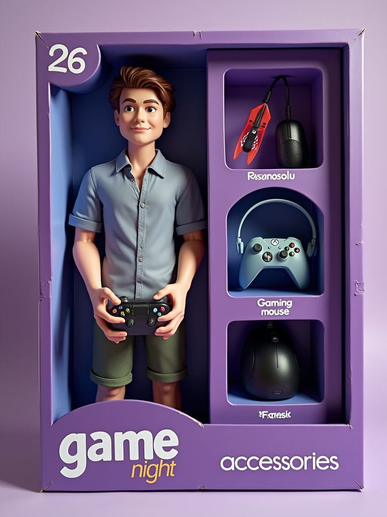 model as an action figure in packaging labeled 'GAME NIGHT'. Use model as a reference for the face. Model is 6 inches tall and dressed in casual gaming attire, and holding a controller. The cardboard section should be purple. Include an 'Accessories' section with items like gaming mouse, gaming headset, and gaming console. Make the design visually appealing and reflective of gaming culture. Do not include the character image on packaging.