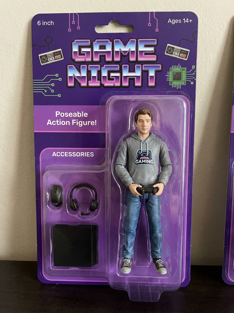 model as an action figure in packaging labeled 'GAME NIGHT'. Use model as a reference for the face. Model is 6 inches tall and dressed in casual gaming attire, and holding a controller. The cardboard section should be purple. Include an 'Accessories' section with items like gaming mouse, gaming headset, and gaming console. Make the design visually appealing and reflective of gaming culture. Do not include the character image on packaging.