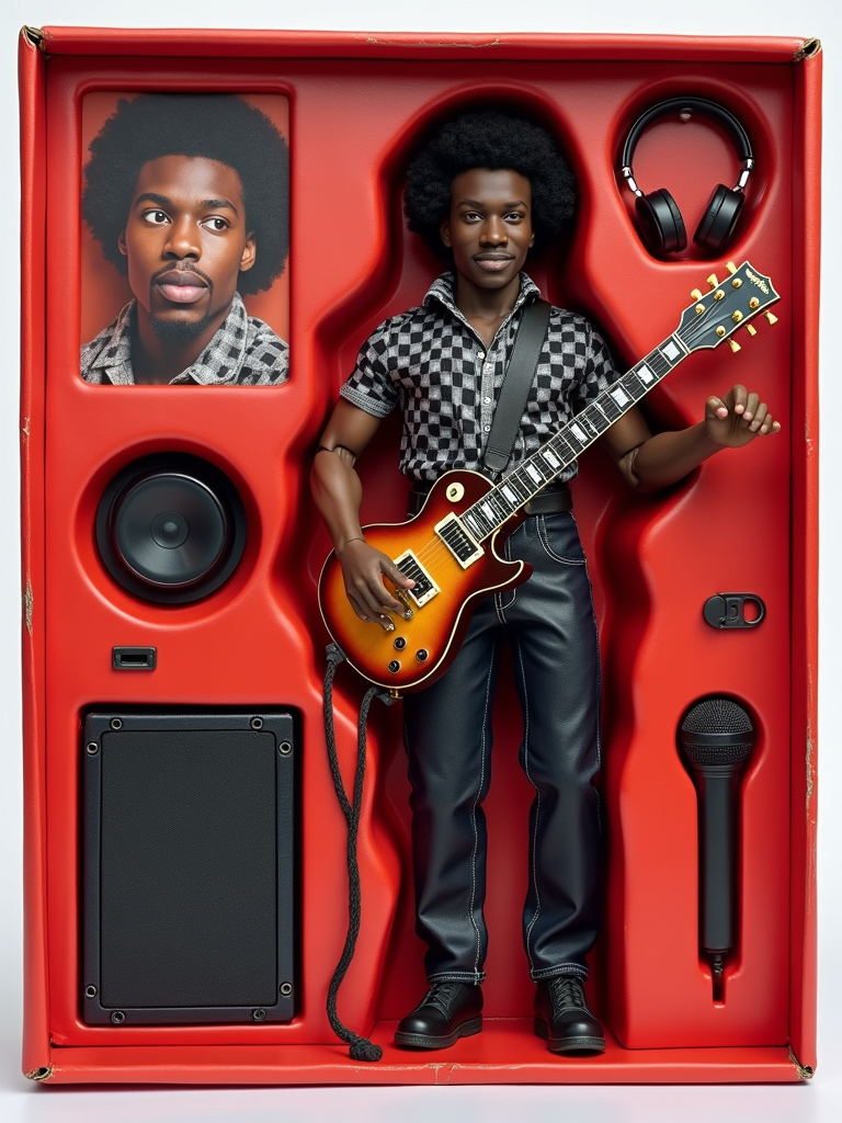 model as an action figure in packaging labeled 'MUSICIAN SERIES'. Use model as a reference for the face. Model is 6 inches tall and dressed in musical attire, and holding a guitar. The cardboard section should be red. Include an 'Accessories' section with items like microphone, music sheet, and headphones. Make the design visually appealing and reflective of music industry. Do not include the character image on packaging.