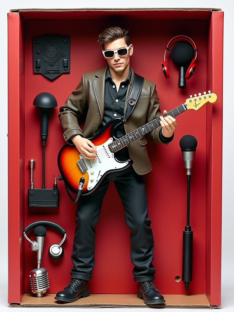 model as an action figure in packaging labeled 'MUSICIAN SERIES'. Use model as a reference for the face. Model is 6 inches tall and dressed in musical attire, and holding a guitar. The cardboard section should be red. Include an 'Accessories' section with items like microphone, music sheet, and headphones. Make the design visually appealing and reflective of music industry. Do not include the character image on packaging.