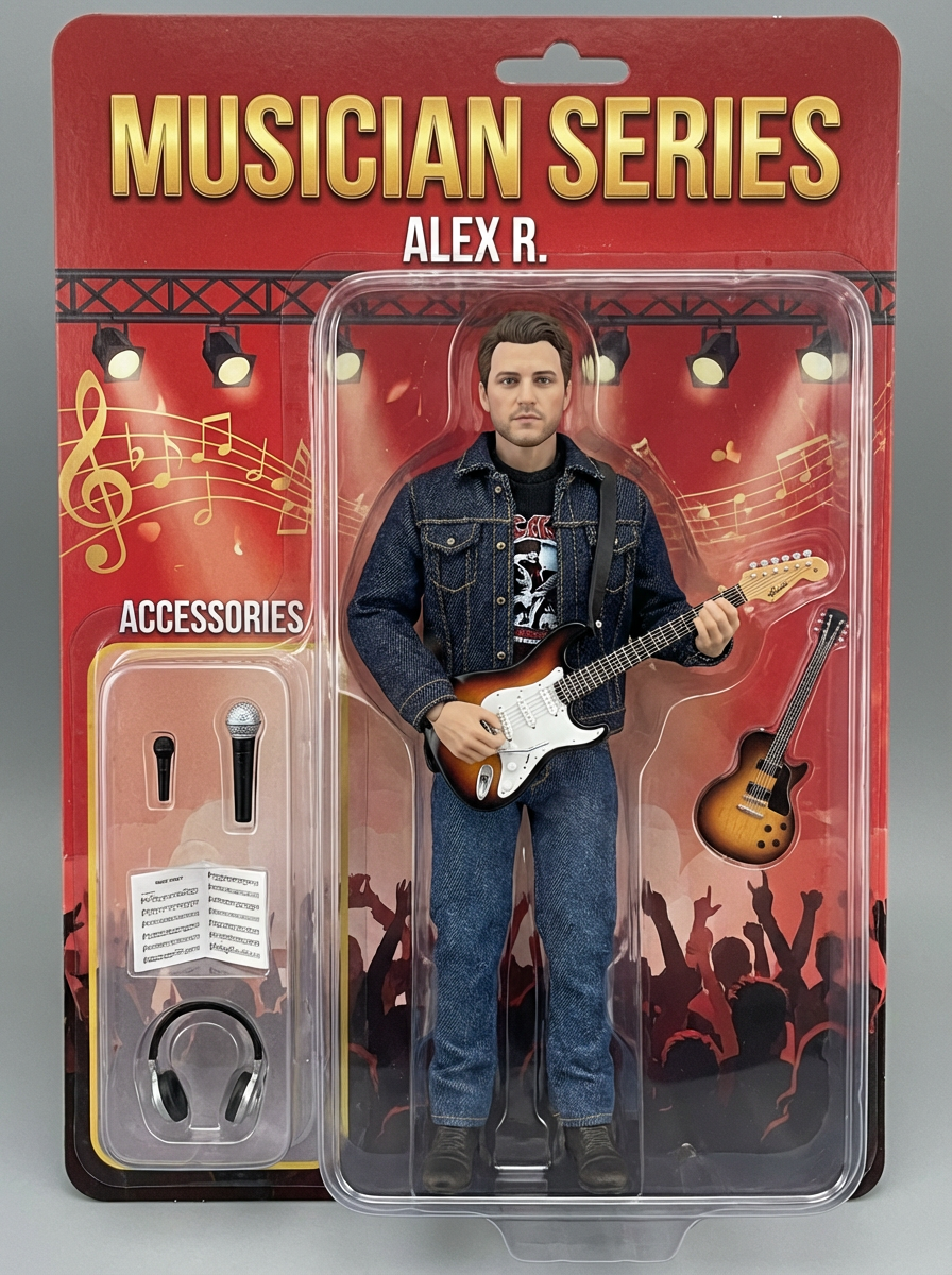 model as an action figure in packaging labeled 'MUSICIAN SERIES'. Use model as a reference for the face. Model is 6 inches tall and dressed in musical attire, and holding a guitar. The cardboard section should be red. Include an 'Accessories' section with items like microphone, music sheet, and headphones. Make the design visually appealing and reflective of music industry. Do not include the character image on packaging.
