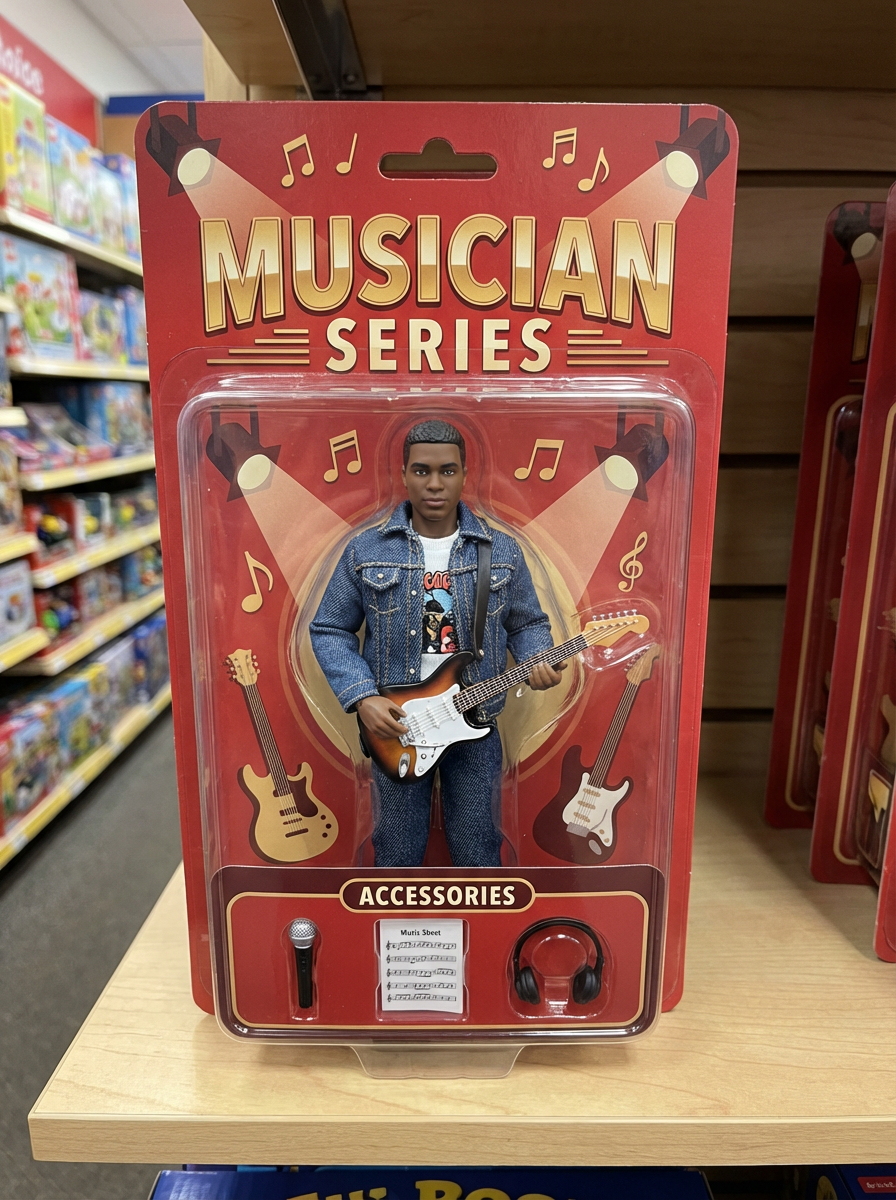 model as an action figure in packaging labeled 'MUSICIAN SERIES'. Use model as a reference for the face. Model is 6 inches tall and dressed in musical attire, and holding a guitar. The cardboard section should be red. Include an 'Accessories' section with items like microphone, music sheet, and headphones. Make the design visually appealing and reflective of music industry. Do not include the character image on packaging.