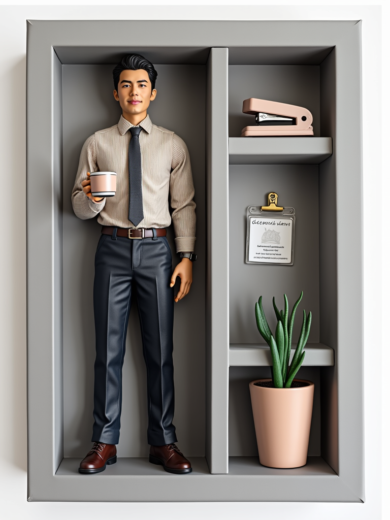 model as an action figure in packaging labeled 'OFFICE HERO'. Use model as a reference for the face. Model is 6.5 inches tall and dressed in office attire, and holding a coffee mug. The cardboard section should be gray. Include an 'Accessories' section with items like stapler, desk plant, and ID badge. Make the design visually appealing and reflective of office environment. Do not include the character image on packaging.