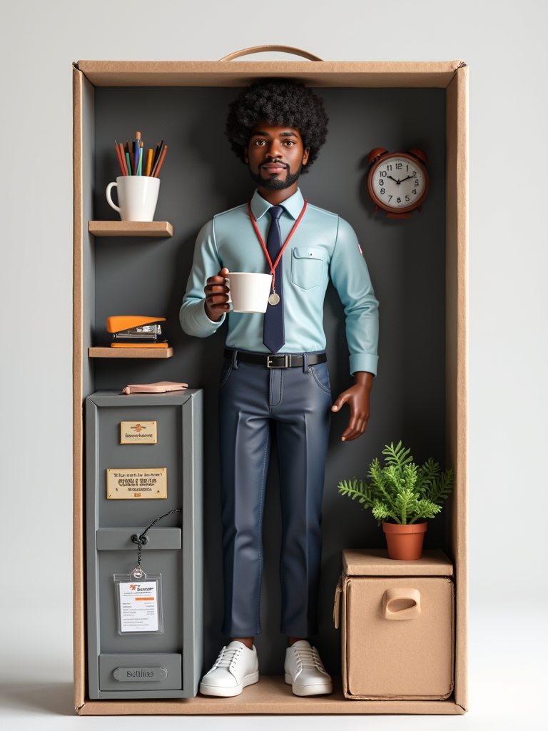 model as an action figure in packaging labeled 'OFFICE HERO'. Use model as a reference for the face. Model is 6.5 inches tall and dressed in office attire, and holding a coffee mug. The cardboard section should be gray. Include an 'Accessories' section with items like stapler, desk plant, and ID badge. Make the design visually appealing and reflective of office environment. Do not include the character image on packaging.