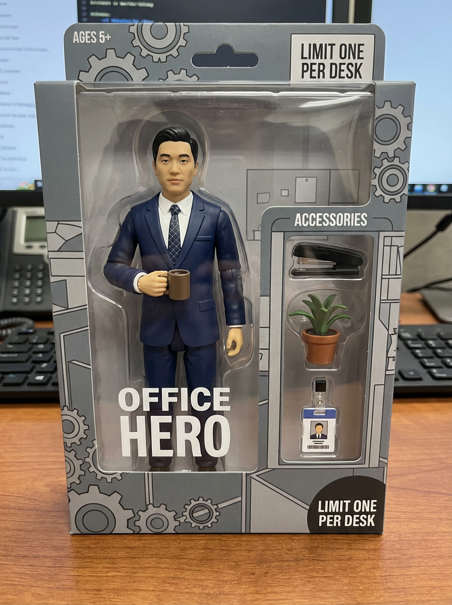 model as an action figure in packaging labeled 'OFFICE HERO'. Use model as a reference for the face. Model is 6.5 inches tall and dressed in office attire, and holding a coffee mug. The cardboard section should be gray. Include an 'Accessories' section with items like stapler, desk plant, and ID badge. Make the design visually appealing and reflective of office environment. Do not include the character image on packaging.