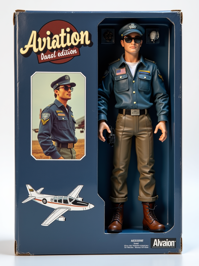 model as an action figure in packaging labeled 'PILOT EDITION'. Use model as a reference for the face. Model is 6 inches tall and dressed in pilot uniform with cap, and holding aviator sunglasses. The cardboard section should be navy blue. Include an 'Accessories' section with items like pilot headset, flight manual, and model airplane. Make the design visually appealing and reflective of aviation profession. Do not include the character image on packaging.